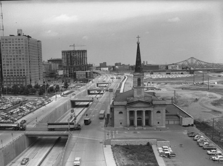 Your view today is northbound, the depressed section of I-70 at the Old Cathedral and emerging Gateway Arch grounds in 1965. The Mansion House Apartments can be seen under construction in the distance.